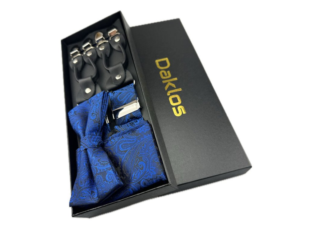 Luxusní set modrý se vzorem - Motýlek, kšandy (šle) a kapesníček v dárkovém balení