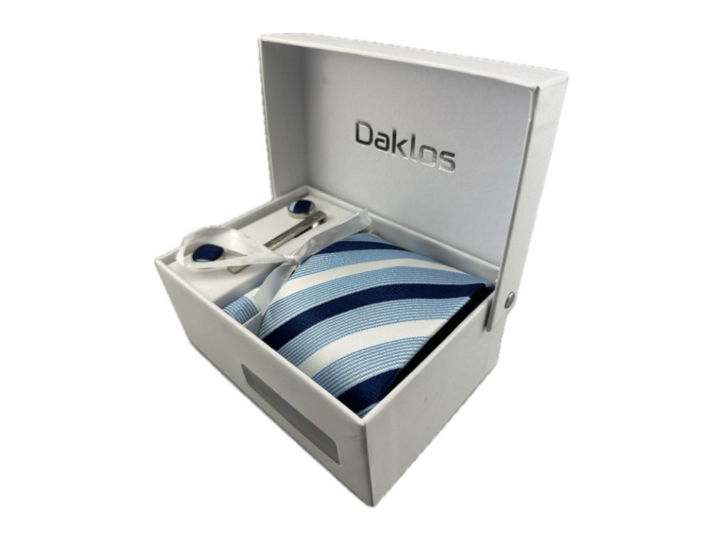 Luxusní set různé modré a bílé pruhy - Kravata, kapesníček, manžetové knoflíčky, kravatová spona v dárkové krabičce