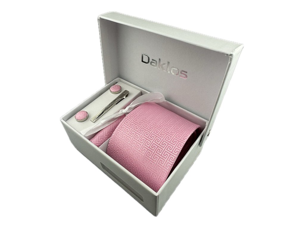 Luxusní set růžový s bílým vzorem - Kravata, kapesníček do saka, manžetové knoflíčky, kravatová spona v dárkovém balení