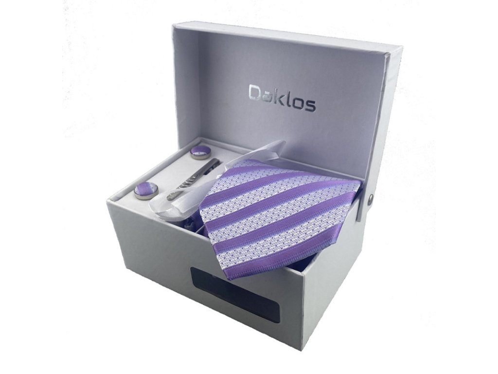 Luxusní set s fialovými a stříbrnými s pruhy - Kravata, kapesníček, manžetové knoflíčky, kravatová spona v dárkovém balení