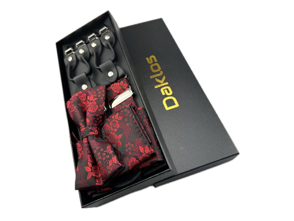 Luxusní set tmavě červený se vzorem květin - Motýlek, kšandy (šle) a kapesníček v dárkovém balení