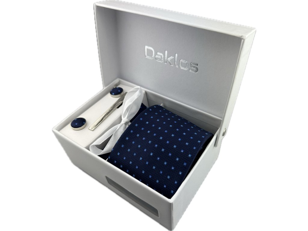 Luxusní set tmavě modrý s kostičkami - Kravata, kapesníček, manžetové knoflíčky, kravatová spona v dárkovém balení