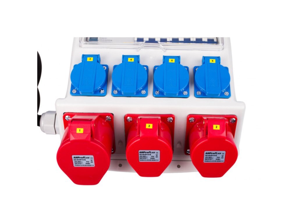 Rozvodná skříň má kabel se vstupem 32A 5P o délce 140 cm. Dále má 7 výstupů, 4 zásuvky 16A, 2 zásuvky 16A 5P a zásuvku 32A 5P.