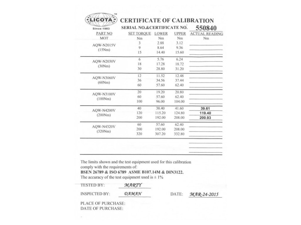 Ke klíči se dodává certifikát kalibrace viz. foto.