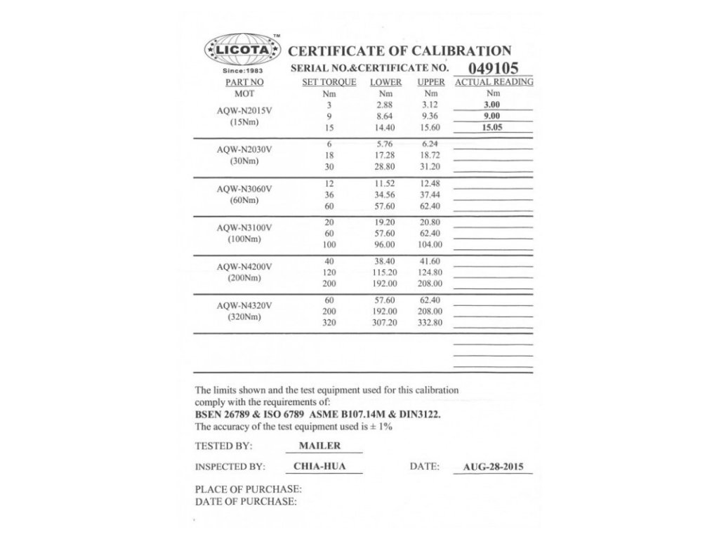 - Ke klíči se dodává certifikát kalibrace.