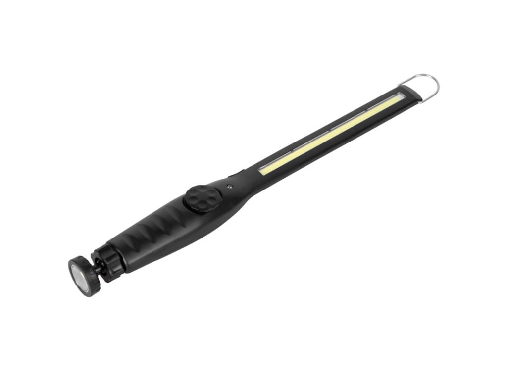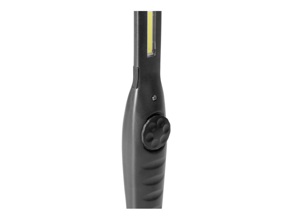 Dobíjecí pracovní svítilna s výkonným 5W COB LED čipem poskytuje světelný tok 200 lumenů a nabízí plynulou regulaci jasu pomocí otočného spínače.