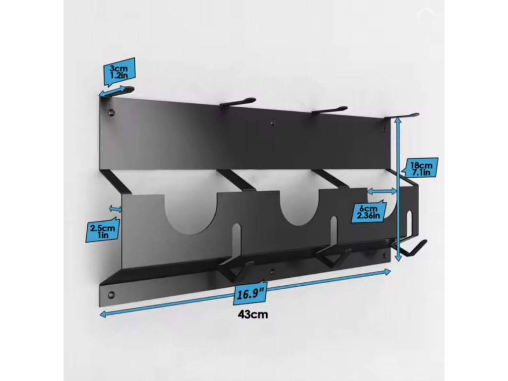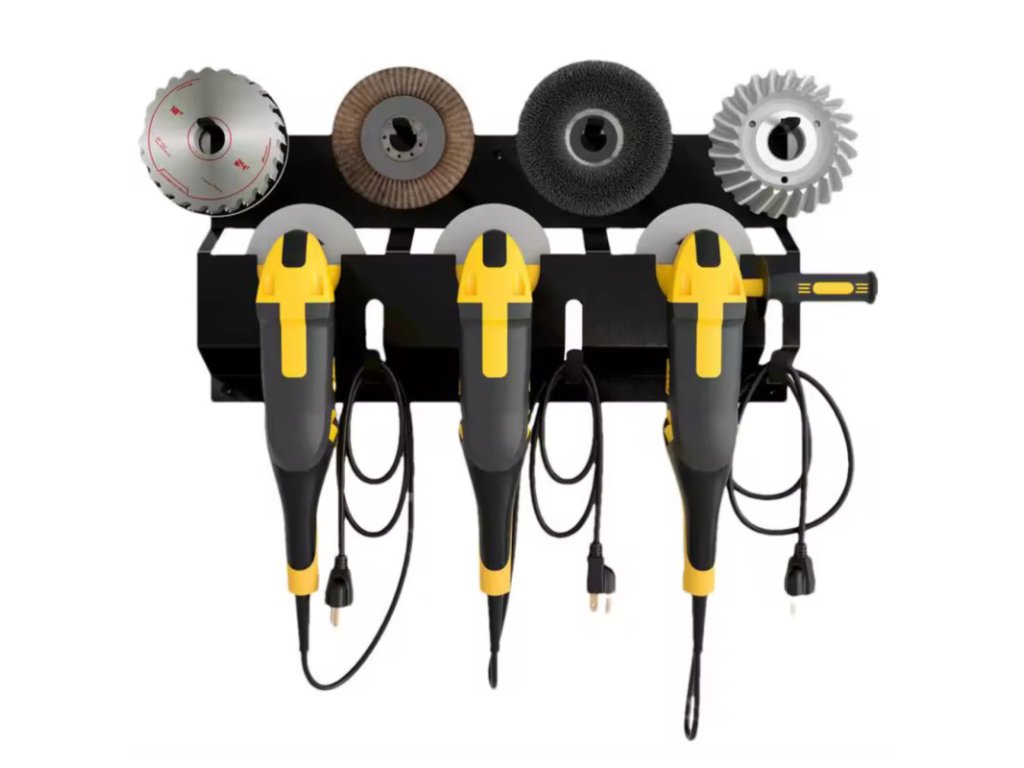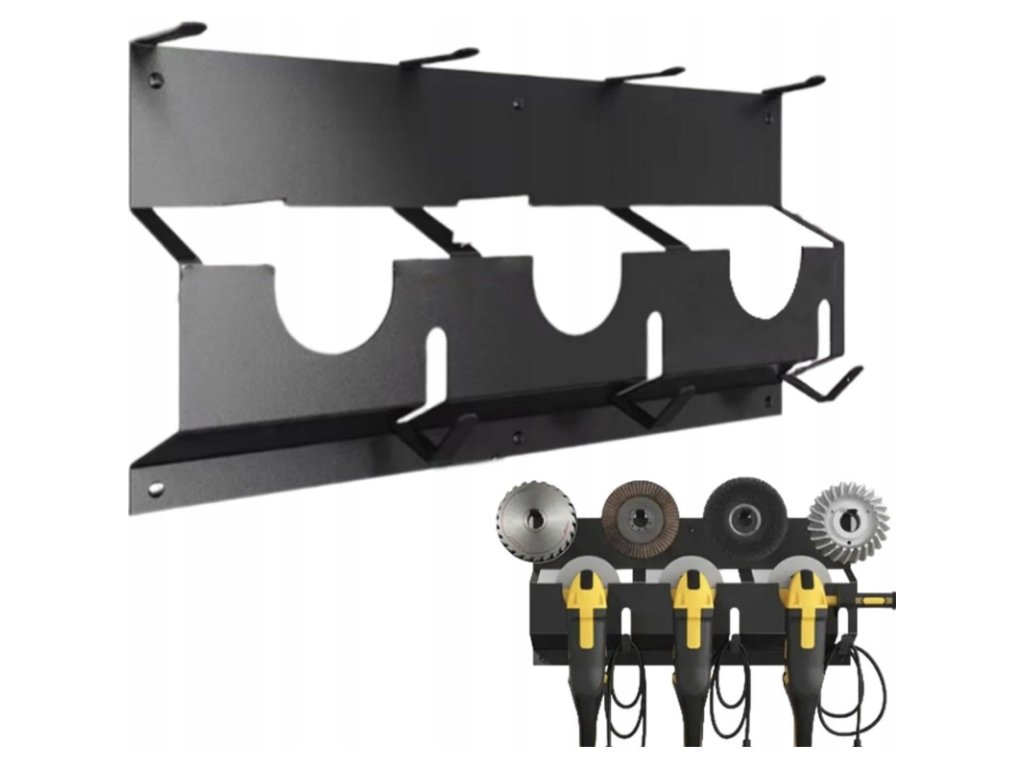 Tento nástěnný držák na 3 brusky a 4 kotouče je nepostradatelný pomocník pro každého, kdo chce mít dílnu v pořádku a nářadí vždy připravené k použití.