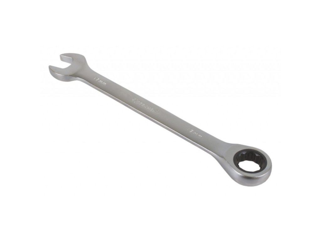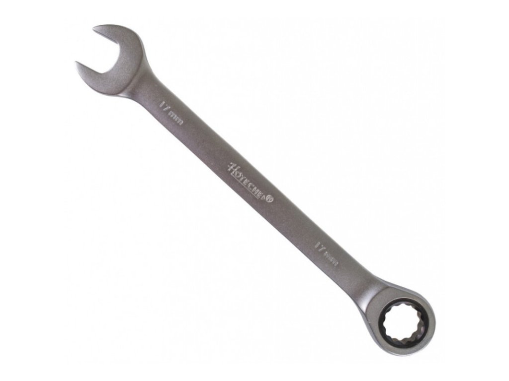Ráčnový očkoplochý klíč od značky Hoteche o rozměru 17 mm je na jedné straně klasický stranový klíč, na straně druhé očkový klíč s dvanáctihranným profilem vybaveným ráčnou s jemným dělením 72 zubů. Celková délka klíče je 220 mm.