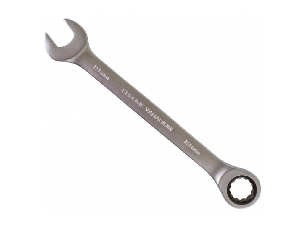 Ráčnový očkoplochý klíč od značky Hoteche o rozměru 19 mm je na jedné straně klasický stranový klíč, na straně druhé očkový klíč s dvanáctihranným profilem vybaveným ráčnou s jemným dělením 72 zubů. Celková délka klíče je 240 mm.