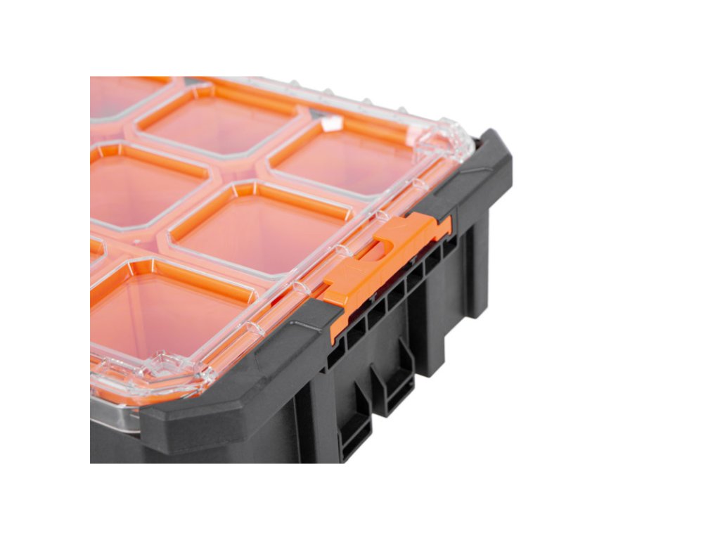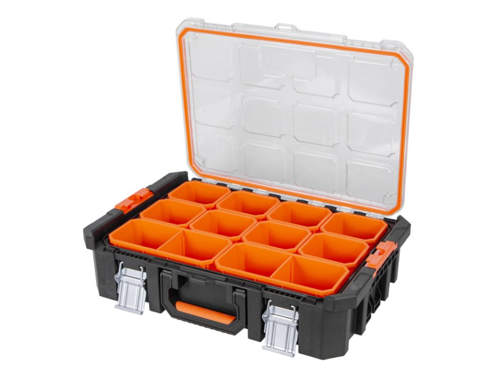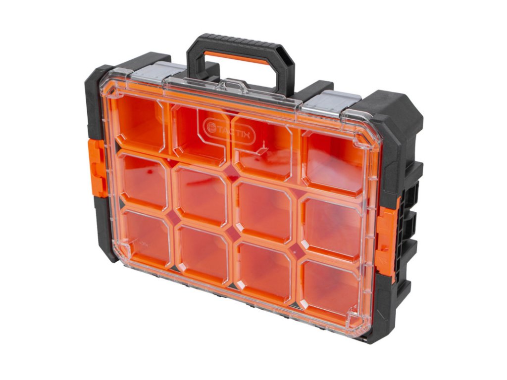 Organizér s 12 přihrádkami z řady Tactix boxů na nářadí je skvělý pro ukládání vašeho drobného spotřebního materiálu. Do vyjímatelných přihrádek snadno uložíte vaše matice, podložky šroubů a podobné předměty.