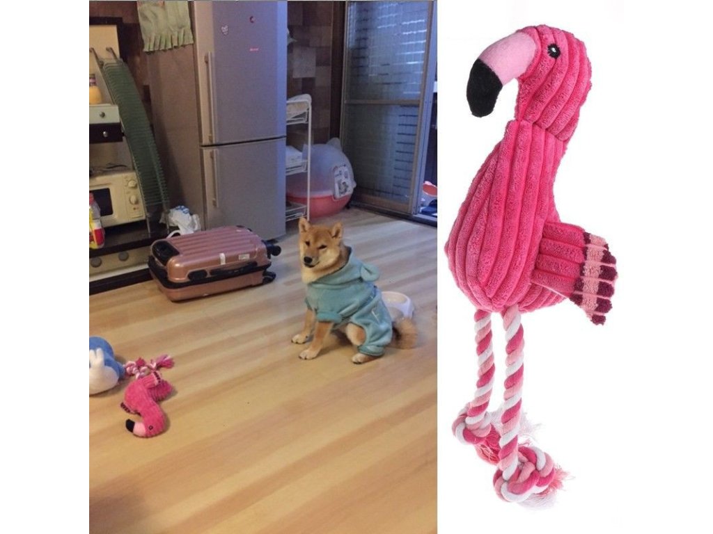 Pískajicí plyšový plameňák nejen hračka pro psy