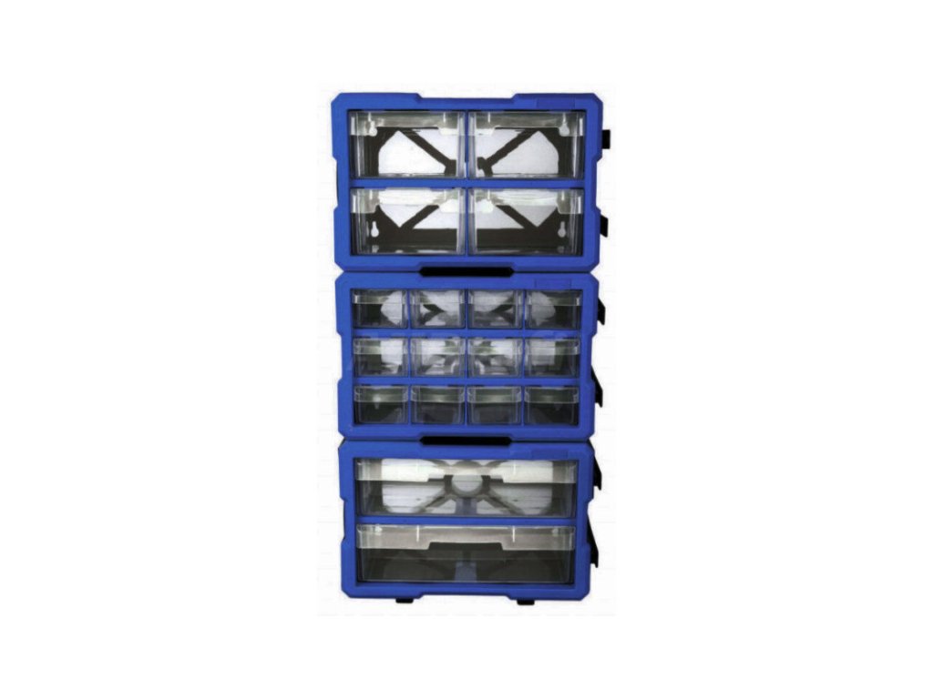 Plastový box má přepážku, kterou lze vyndat a mít jedno větší skladovací místo. Vhodný pro skladování a roztřídění šroubků, matic i většího nářadí. Box lze snadno vytáhnout z organizéru a zase jej vrátit zpět.