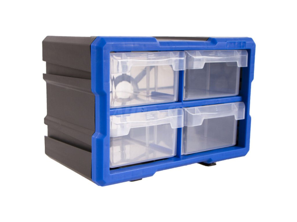 Plastový organizér se 4-mi středně velkými průhlednými boxy, vhodný např. pro uskladnění a přehledné rozdělení šroubků, matic a dalšího nářadí, které by se mohlo zakutálet a ztratit. Každý box má jednu přepážku, kterou můžete vyndat, takže si u každého boxíku můžete vybrat, jestli chcete jedno nebo dvě skladovací místa.