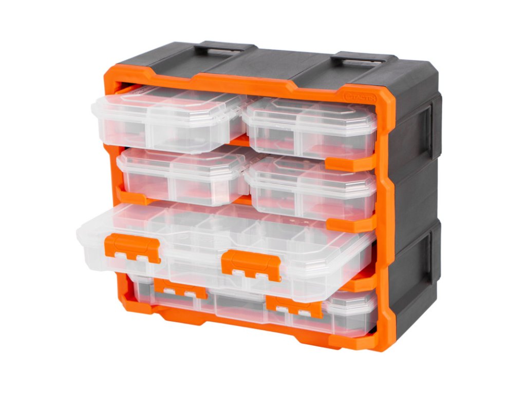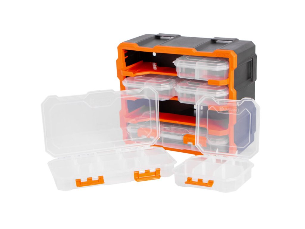 Praktický organizér navržený pro přehledné a bezpečné uložení spojovacího materiálu, drobného nářadí a dalších komponentů v domácích i profesionálních dílnách.