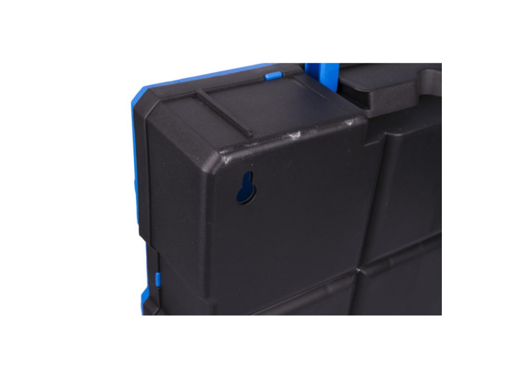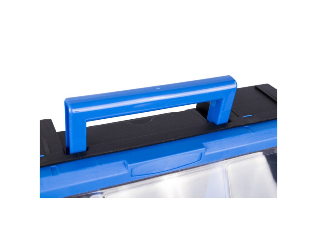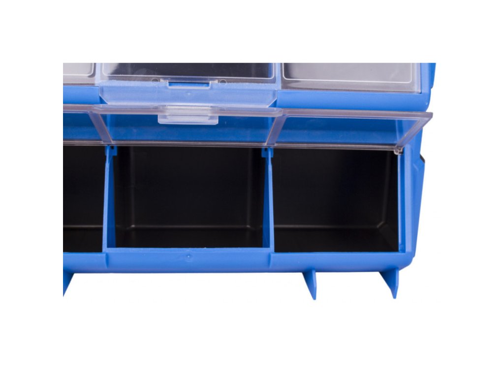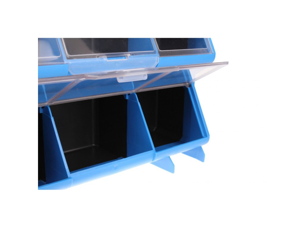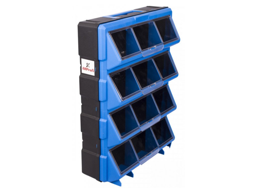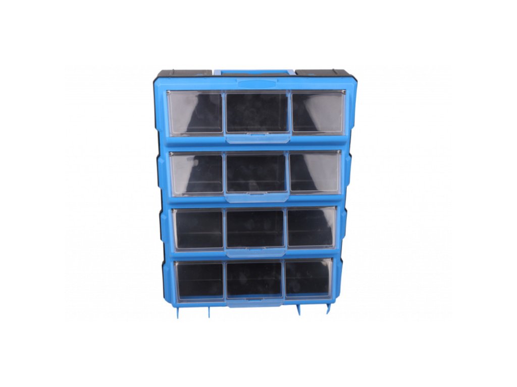 Plastový organizér s 12 zásuvkami lze jednoduše zavěsit na zeď, nebo např. z boku skříně, dílenského vozíku apod. Je možné ho postavit na ponk, nebo pracovní stůl a slouží pro uložení montážního materiálu a drobného dílenského vybavení.