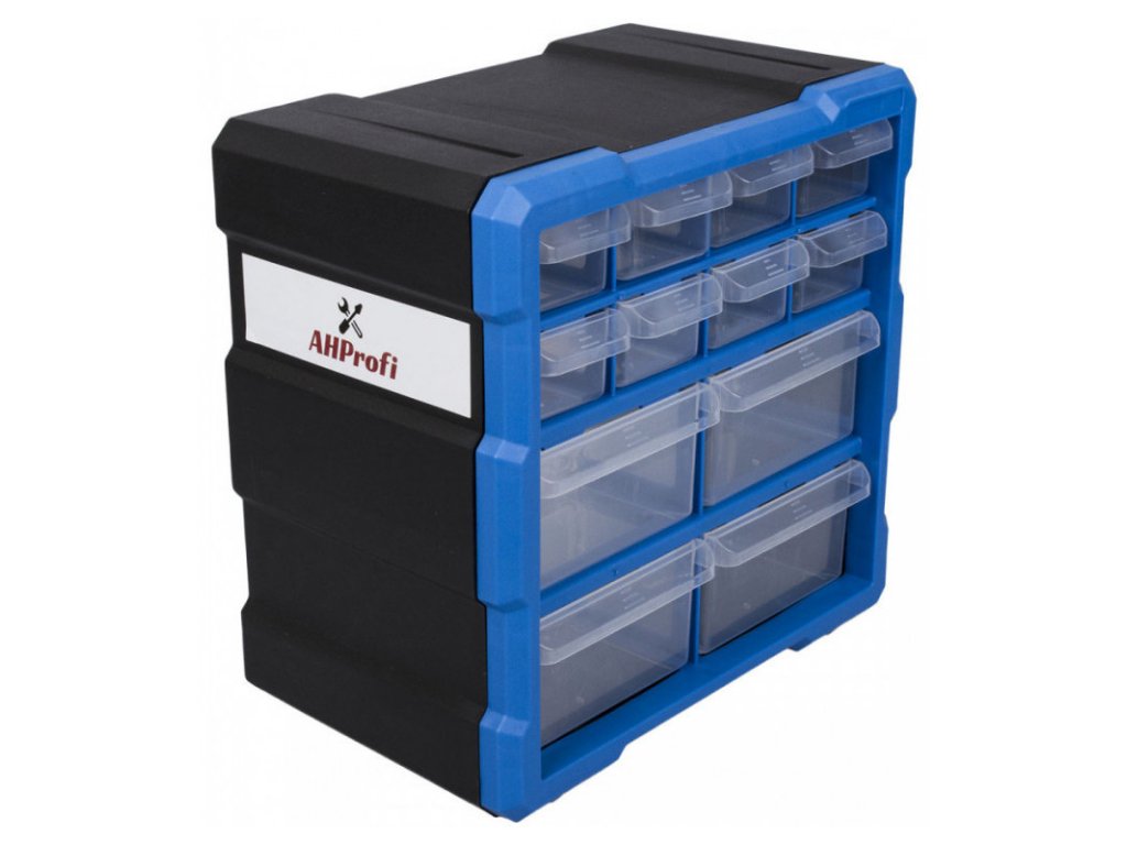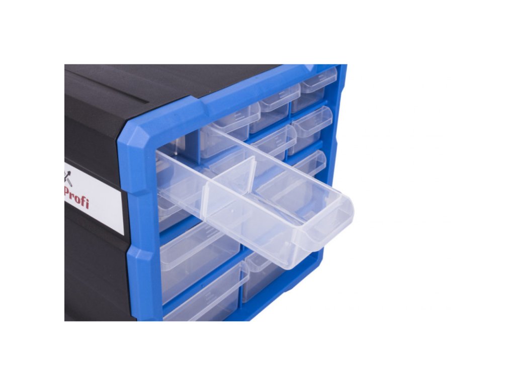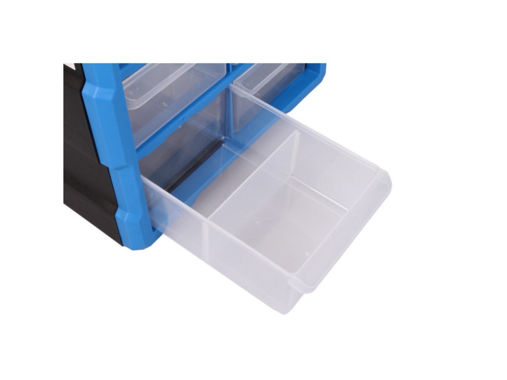 Plastový organizér s 12 zásuvkami lze jednoduše zavěsit na zeď, nebo např. z boku skříně, dílenského vozíku apod. Je možné ho postavit na ponk, nebo pracovní stůl a slouží pro uložení montážního materiálu a drobného dílenského vybavení.