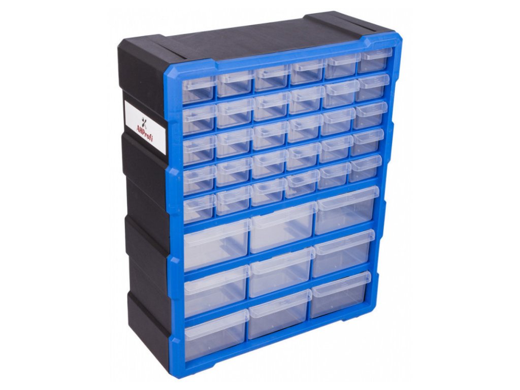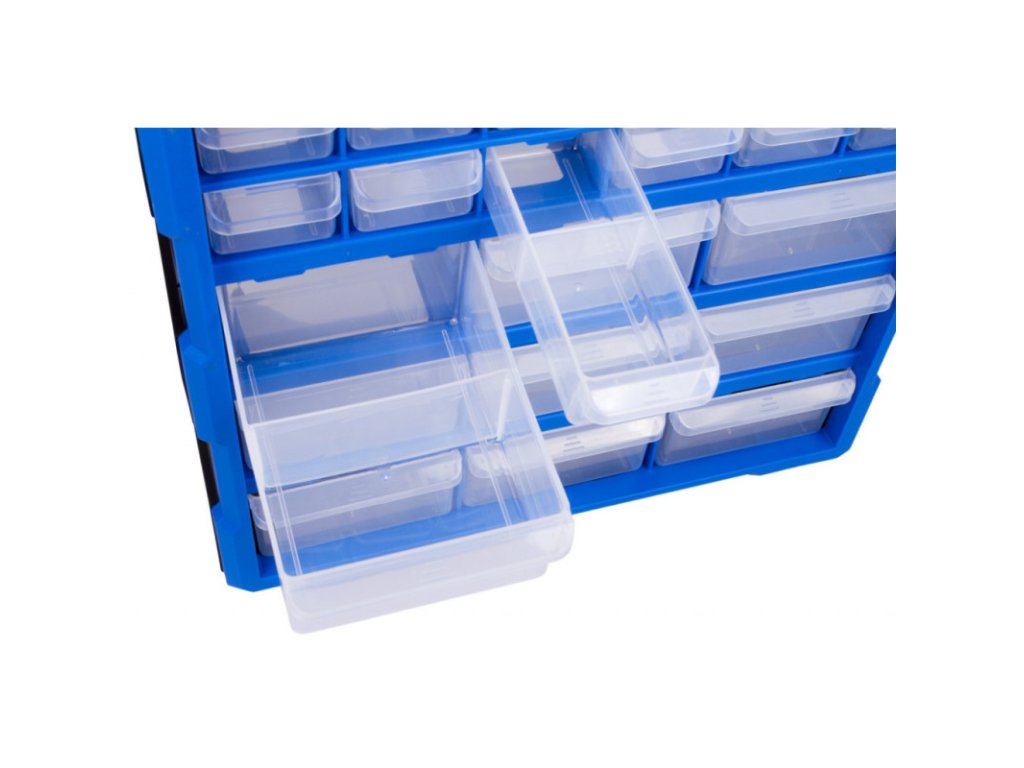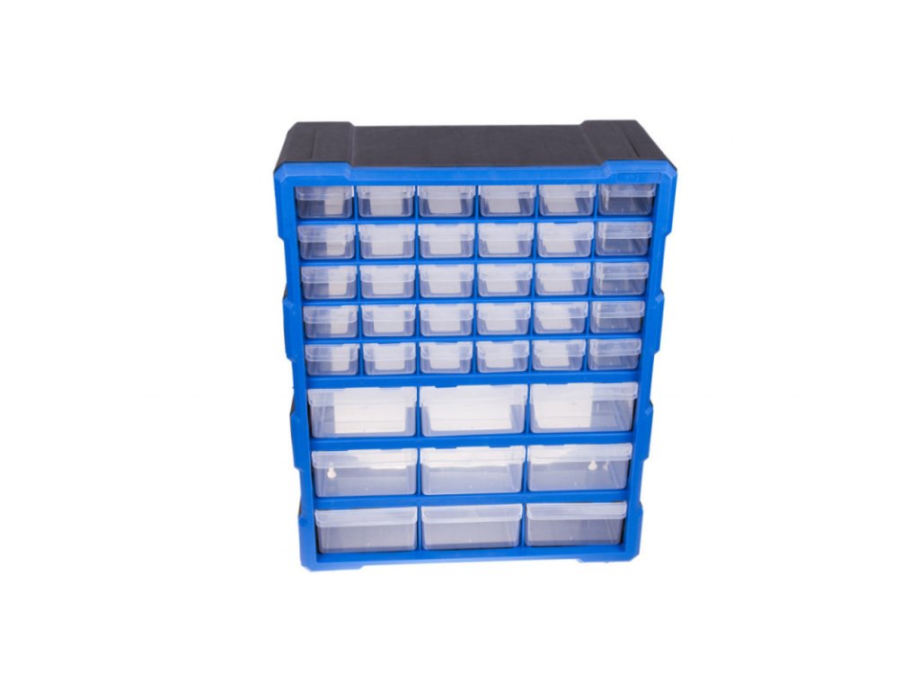 Plastový organizér s 39 zásuvkami lze jednoduše zavěsit na zeď, nebo např. z boku skříně, dílenského vozíku apod. Je možné ho postavit na ponk, nebo pracovní stůl a slouží pro uložení montážního materiálu a drobného dílenského vybavení.