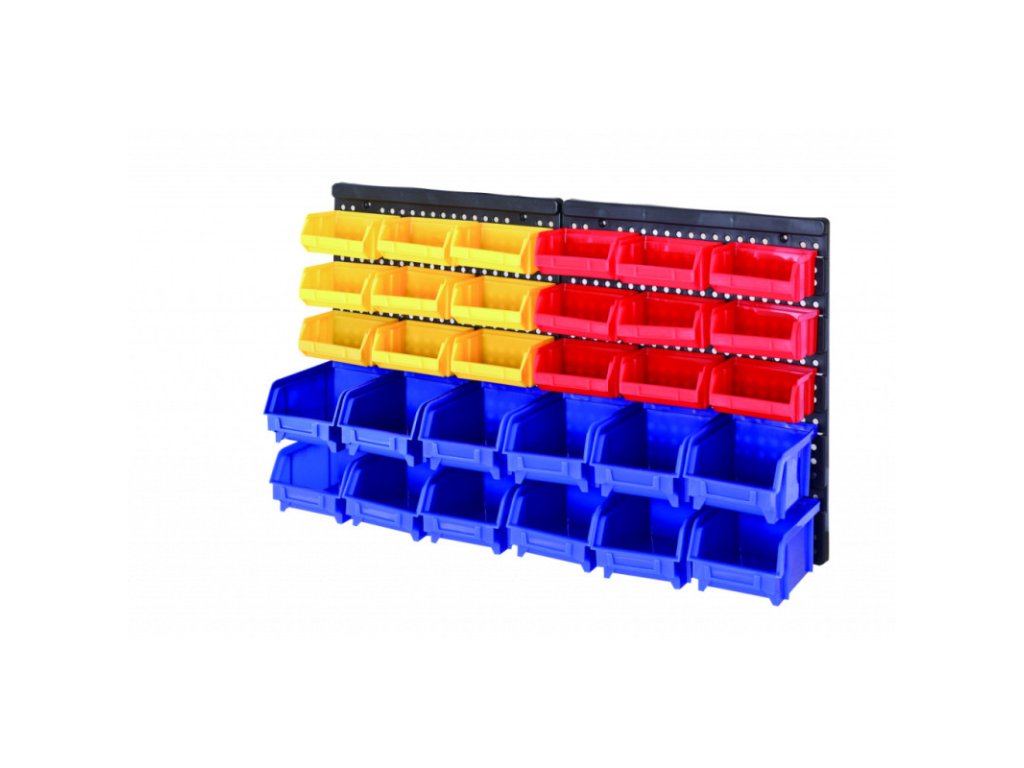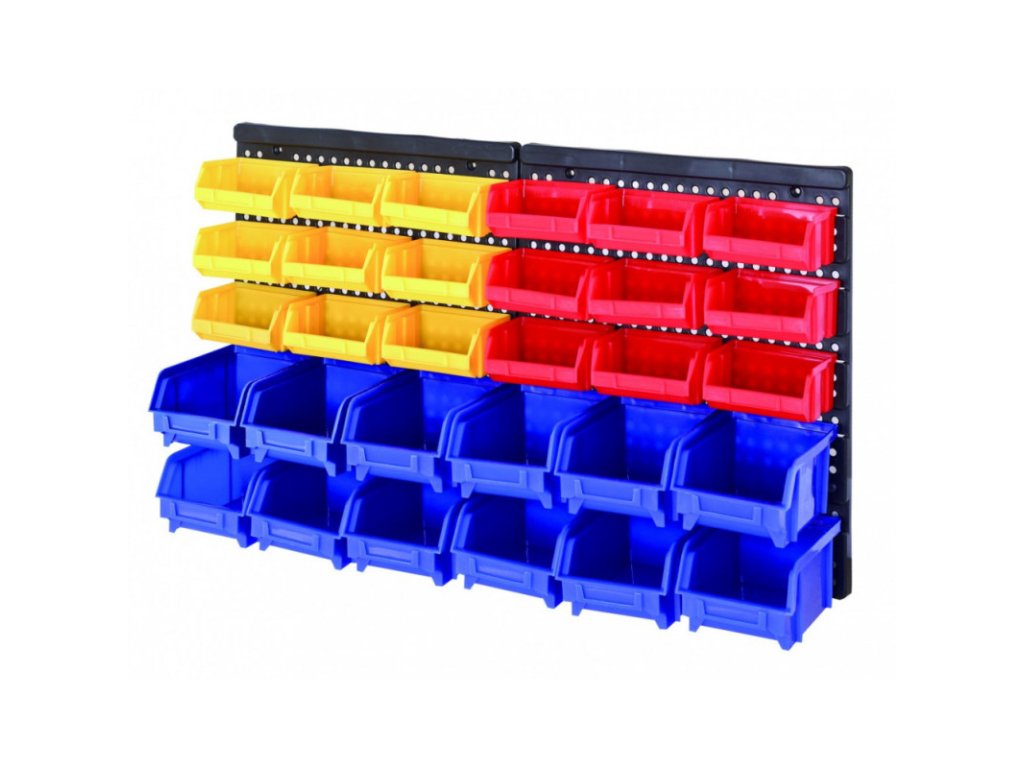 - Plastová závěsná děrovaná deska s 30 plastovými boxy pro dokonalou organizaci v dílně.