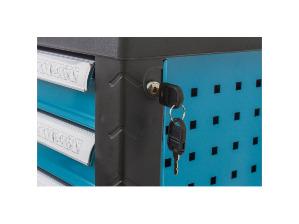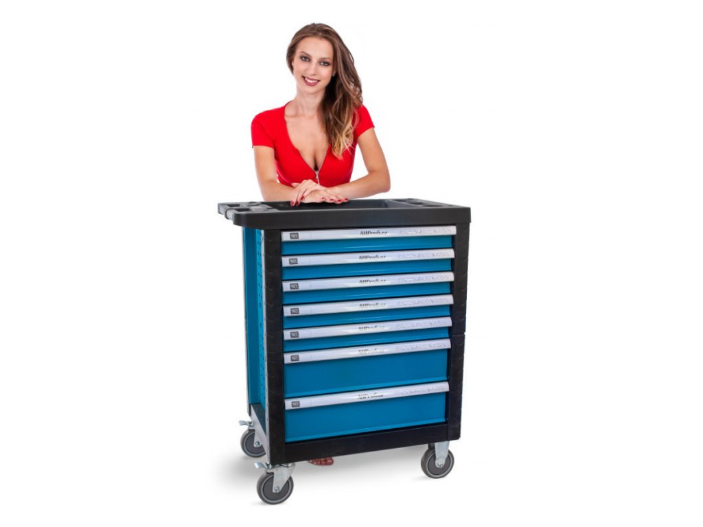 Modrý pojízdný kovový dílenský vozík se 7 šuplíky je vybavený nářadím nezbytným pro práci v dílně.