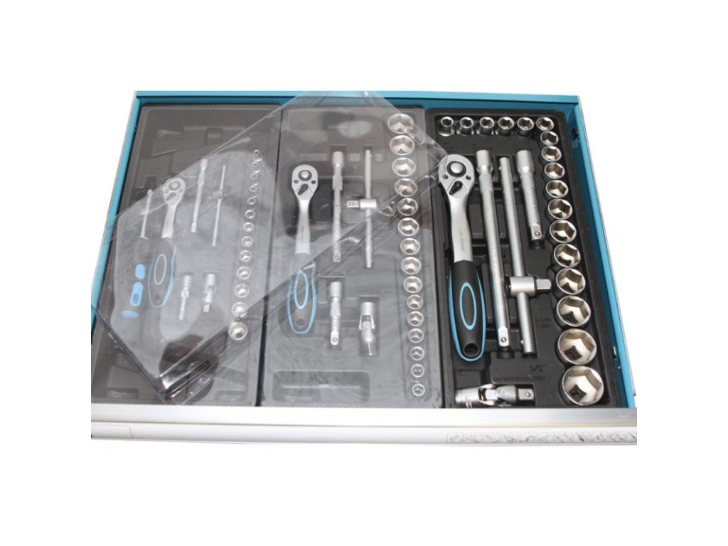 Pět horních zásuvek je vyplněno 272 ks ručního nářadí a 2 volné zásuvky nabízejí prostor pro možnost individuální výbavy nebo odložení např. elektrického nářadí nebo montážního materiálu.