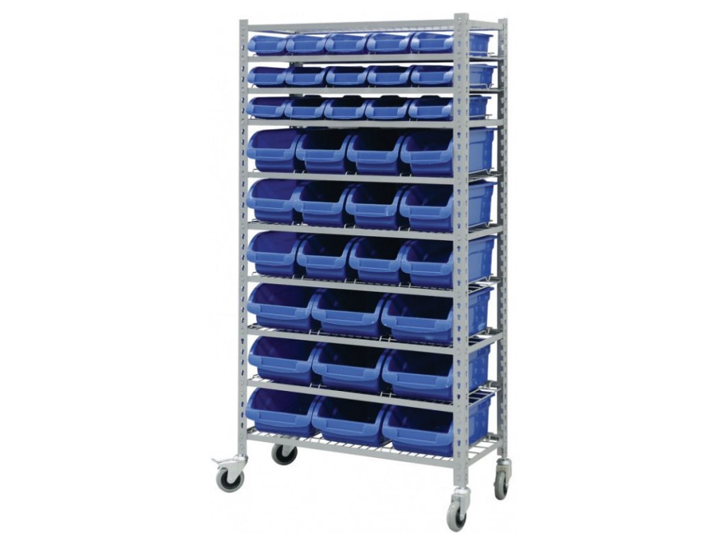 Kovový regál je osazen 10 ks pozinkovanými drátěnými policemi s vodícími kolejnicemi pro plastové boxy a stropem ve stejném provedení. Samotné skladové nádoby jsou z odolného plastu pro dlouhou životnost a jsou uzpůsobeny pro snadné vkládání a odebírání obsahu.
