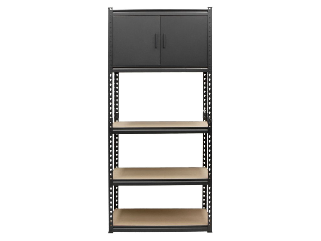 Kombinovaný regálový systém vhodný pro skladování nářadí, materiálu a dílenského vybavení s praktickou horní skříňkou pro uložení.