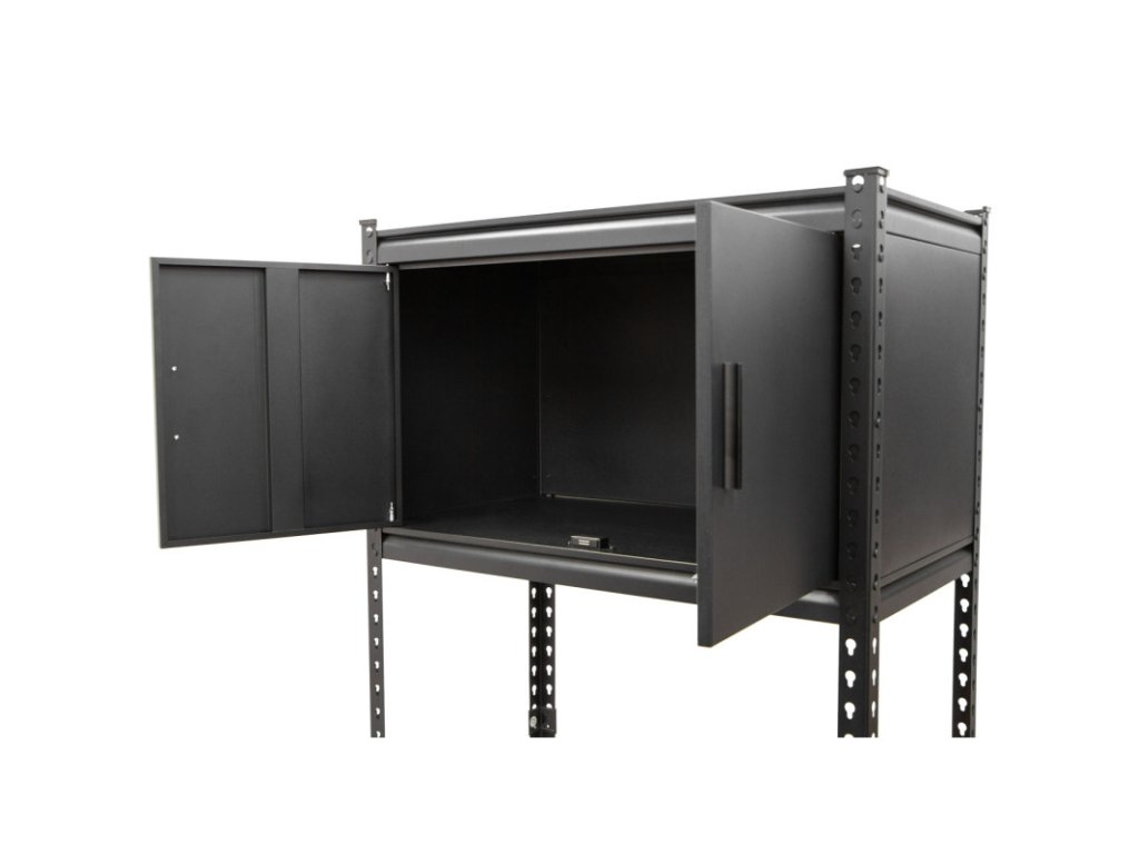 Stabilní rámová konstrukce z kovu se 3 výškově nastavitelnými policemi z MDF a kovovou horní skříňkou s dvojitými dveřmi.
