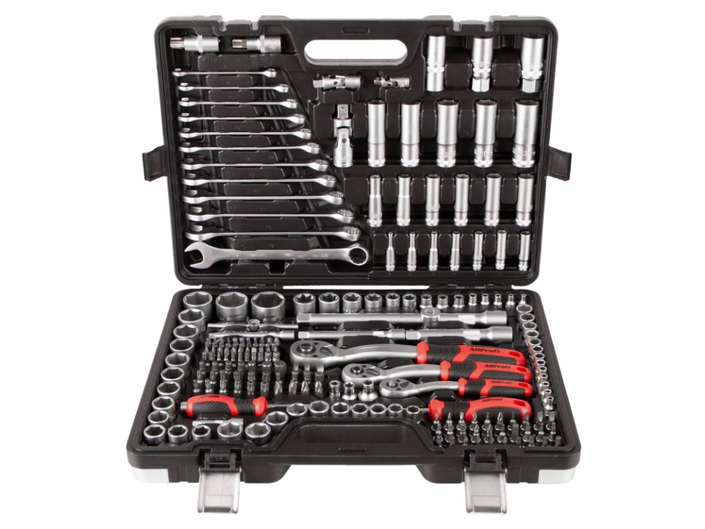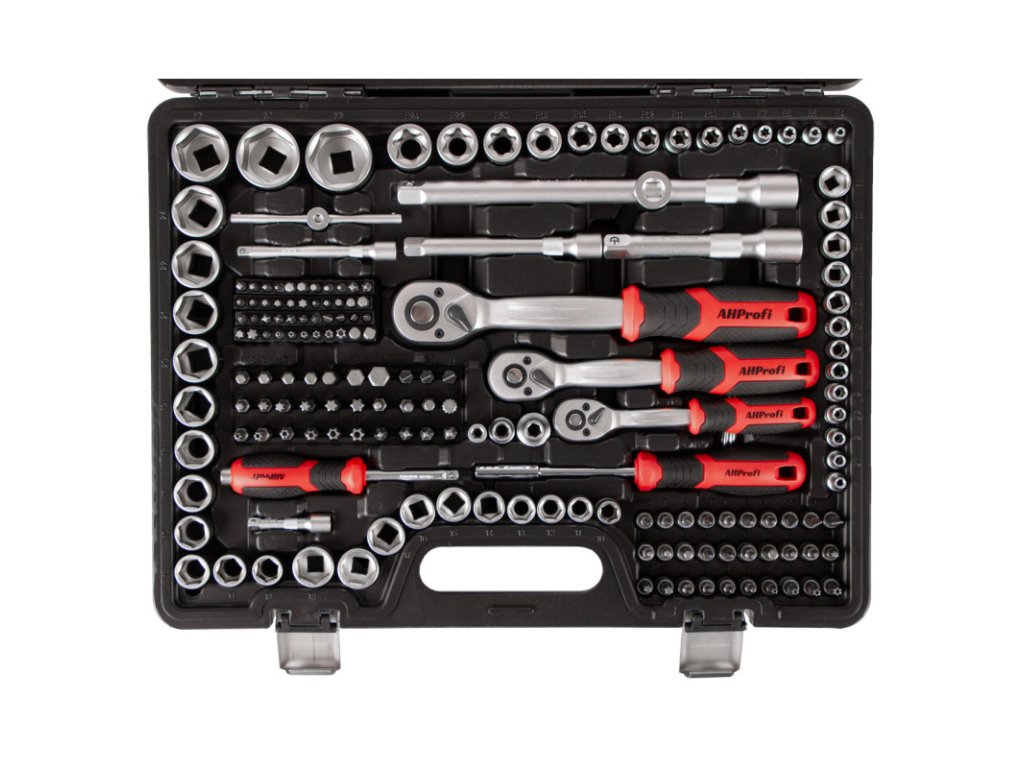 - Komplexní obsah včetně ráčen, očkoplochých klíčů, nástrčných klíčů, bitů aj.