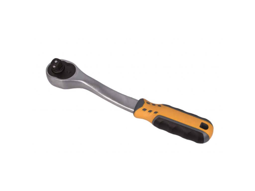 - Vyhnutá ráčna 3/8" s přepínacím mechanismem pro povolování a utahování.