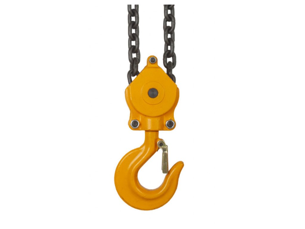 Robustní a pevná ocelová konstrukce se závěsným hákem s pojistkou, obslužným řetězem o průměru 4,8 mm a 3 m dlouhým pozinkovaným zdvihacím řetězem o průměru 8 mm z legované pozinkované oceli.