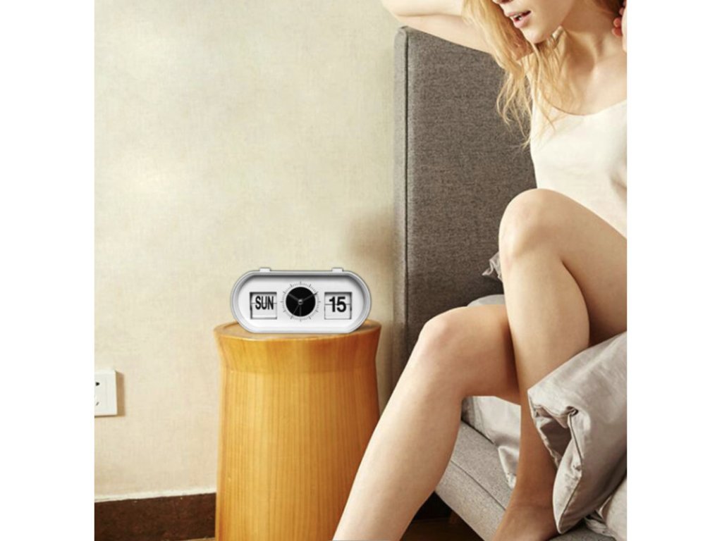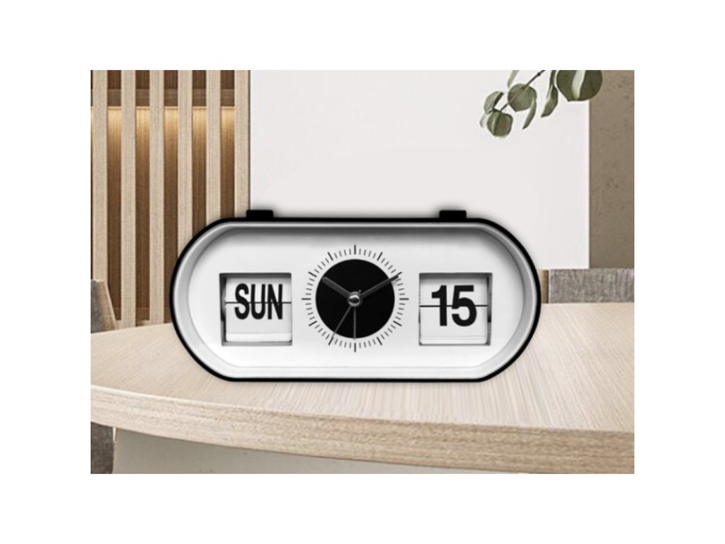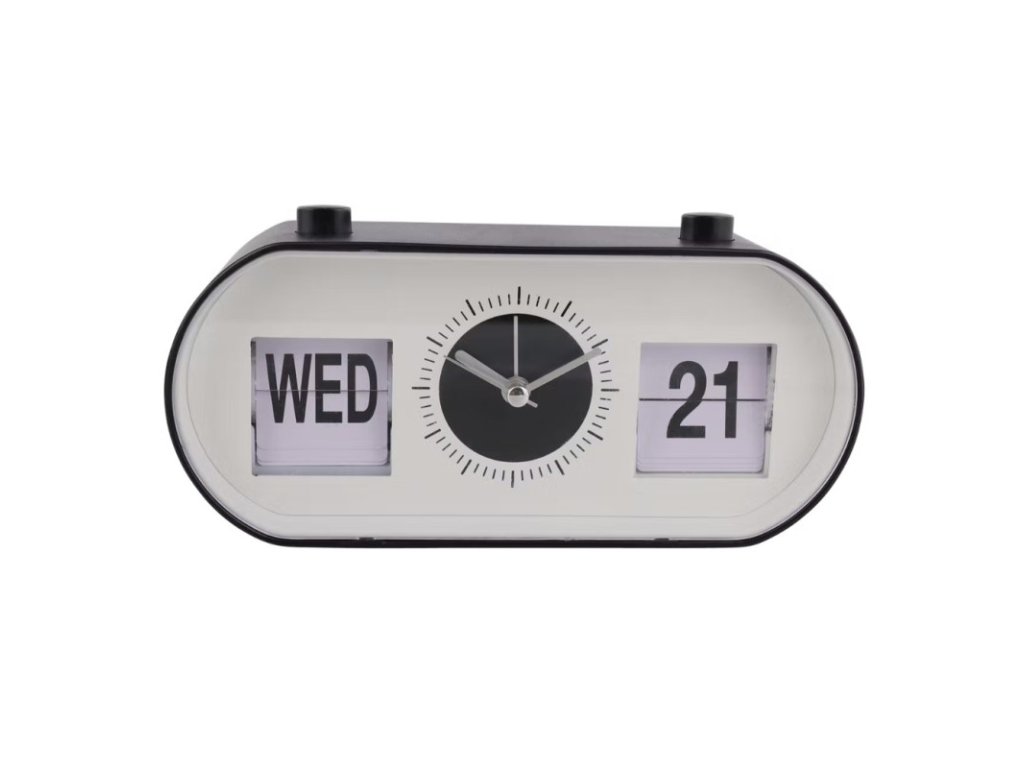 Retro budík MONOGRAPH s kalendářem, hodiny zobrazující den v týdnu a datum - černý s bílým pozadím