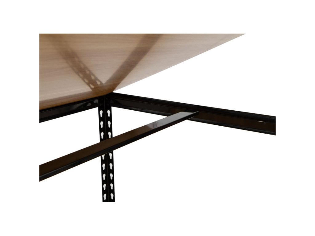 Bezšroubová konstrukce regálu umožňuje snadné a rychlé sestavení bez potřeby nářadí a spojovacího materiálu. Černý design s policemi v lesklém dřevodekoru dodávají regálu elegantní vzhled. Jeho zaoblené hrany zajišťují bezpečnost a dvě centrální podpěry na každé patro poskytují dodatečnou stabilitu.