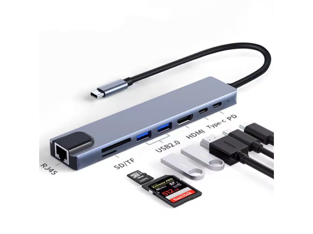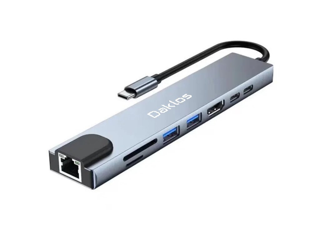 Rozbočovač a adaptér 8 v 1 USB C - 2x USB-C, 4K HDMI, 2x USB, LAN RJ45, micro SD, SD