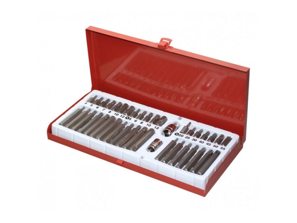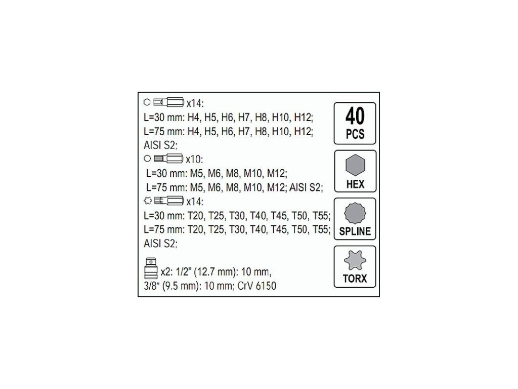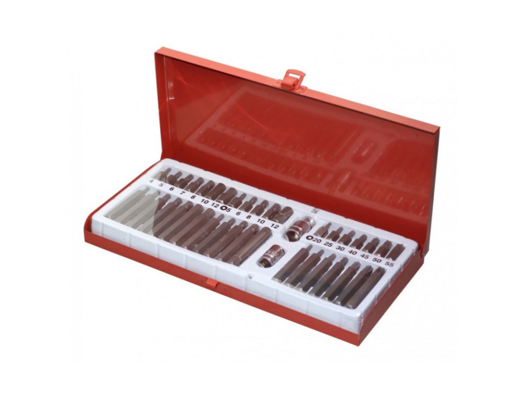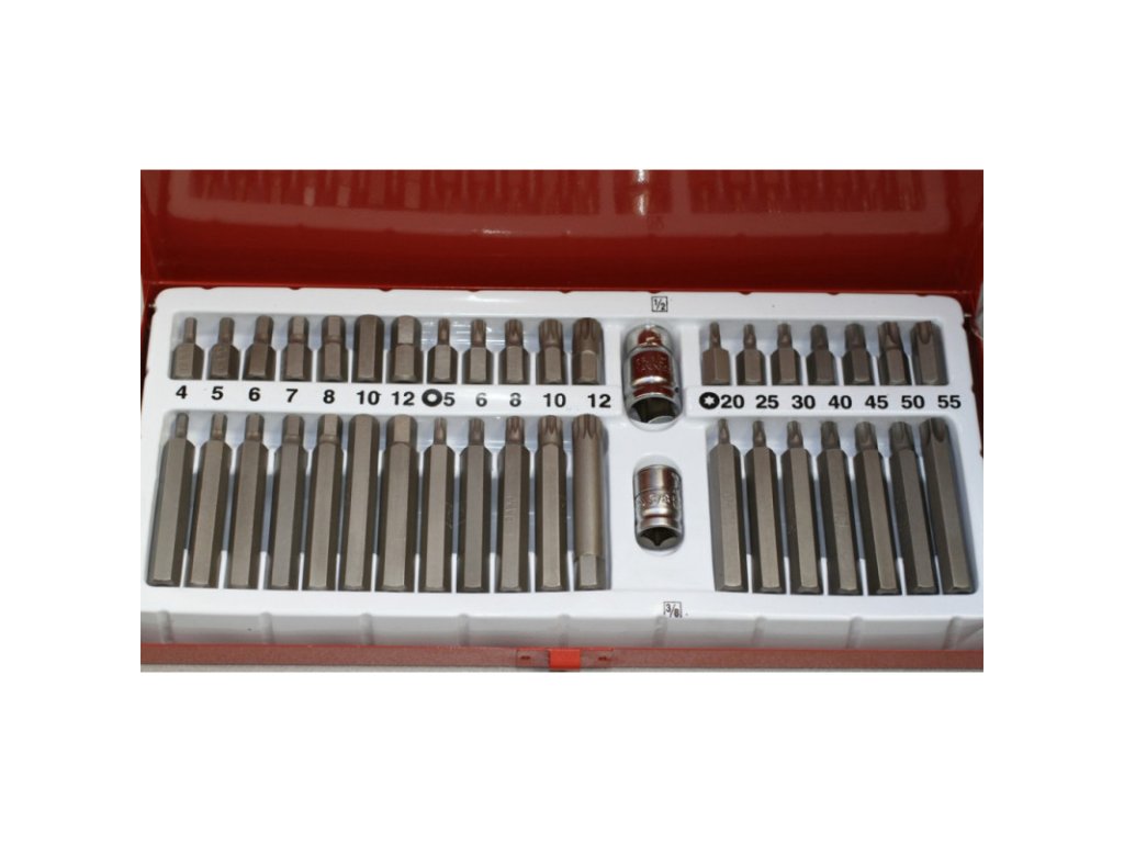 Kompletní sada 40 nejpoužívanějších bitů s profily H (Imbus) - šestihran, M (XZN, SPLINE) - tisícihran a T (Torx) - hvězdička. Sada samozřejmě obsahuje chromové adaptéry k připojení bitů na řáčny 1/2" a 3/8".