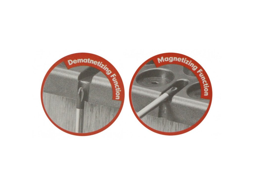 Všech 7 šroubováku je usazeno do plastového držáku, který je opatřen magnetem. Tato „vychytávka” je určena pro zmagnetizování a odmagnetizování hrotu šroubováků. Jedná se o velice praktickou věc, kdy výrobce nechává volbu magnetického hrotu šroubováku na samotném montérovi. Když bude nutné šroub vytáhnout z nepřístupného místa, zmagnetizujete. Když se bude na šroubovák přichytávat kovový prach, piliny apod., odmagnetizujete.