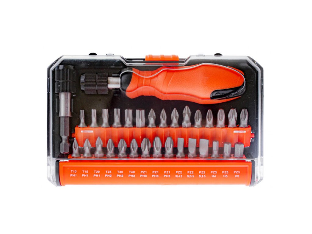 Sada 30 kusů bitů, dále se šroubovákem a rychloupínacím držákem bitů. Sada je přehledně uložena v plastovém boxu. Sada se skvěle hodí do garáže pro domácí účely, ale i do dílen pro profesionální každodenní použití.