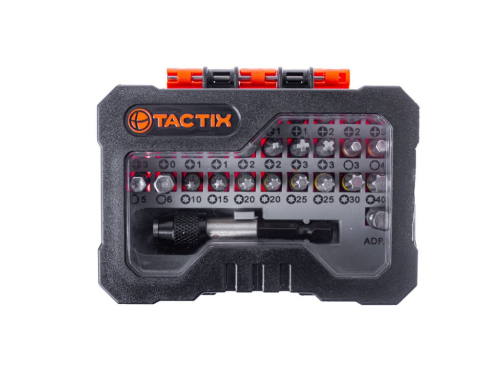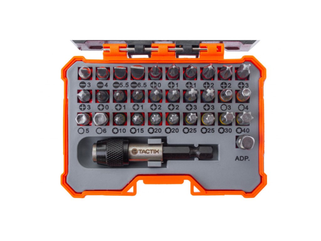 Sada 32 kusů bitů s adaptérem nesmí chybět u žádné AKU vrtačky a šroubováku nebo šroubováku na bity. Sada je přehledně uložena v plastovém boxu - jednotlivé druhy bitů jsou barevně označeny.
