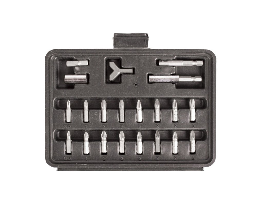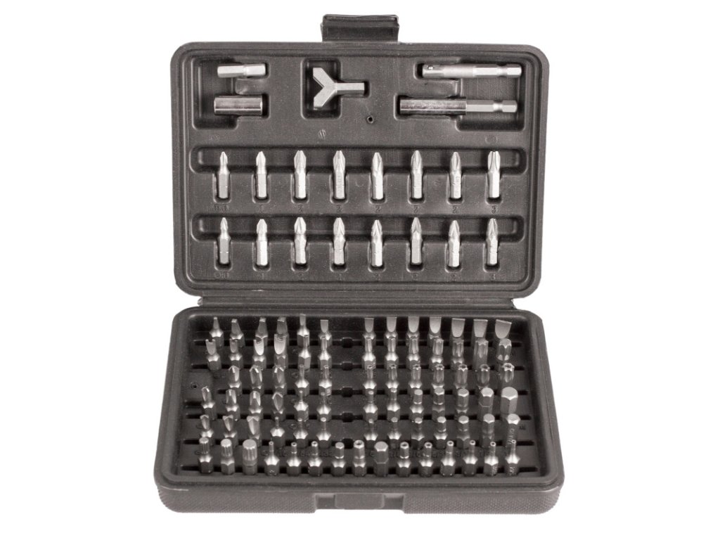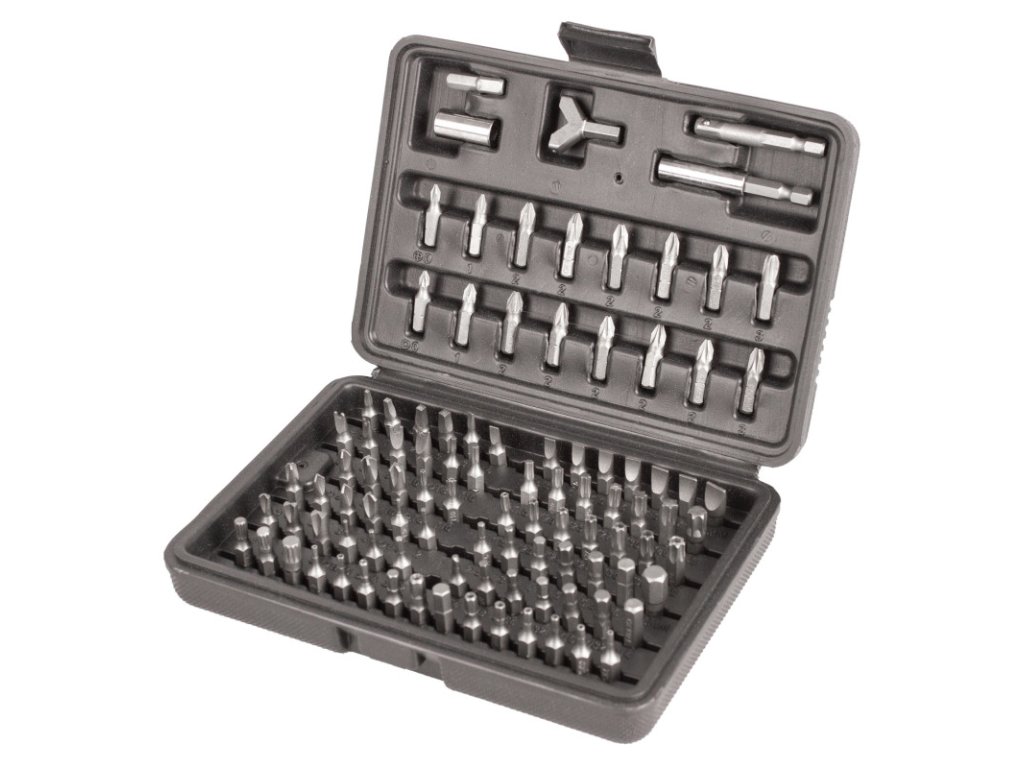 Komplexní sada bitů v plastovém kufru se 100 díly. Sada se dobře skladuje i přenáší a snadno udržíte pořádek mezi jednotlivými bity. Díky přehlednému uložení lze snadno kontrolovat kvalitu/unavenost jednotlivých dílů a případně je vyměnit. Bity jsou obsaženy v nejběžněji používaných rozměrech, takže se hodí do profi dílny i pro domácí dílnu.