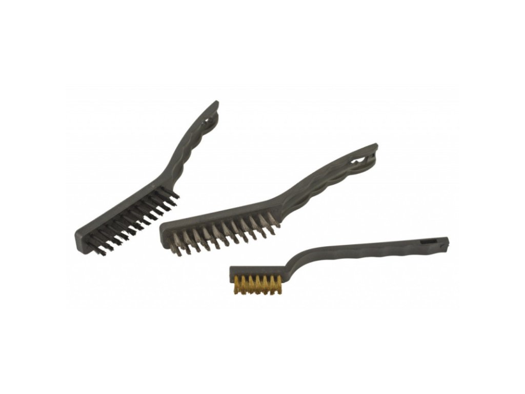 Ergonomicky tvarovaná plastová rukojeť s ocelovými, mosaznými a nylonovými štětinami.