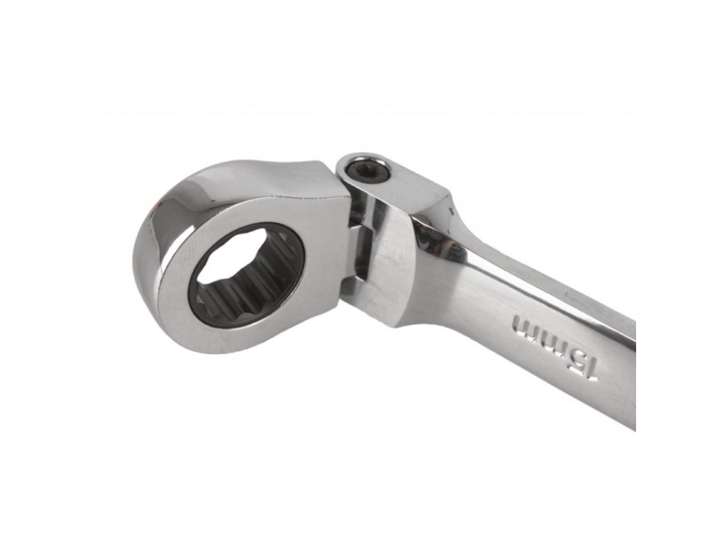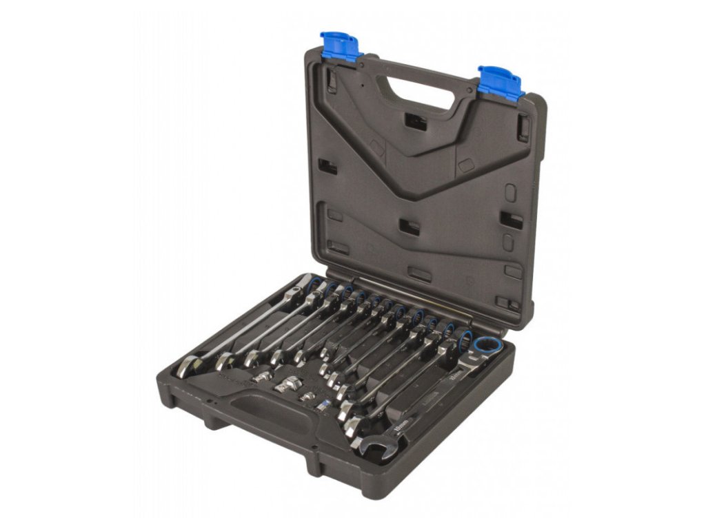 Kompletní sada 16 očkoplochých ráčnových klíčů s otočnou hlavicí, ideální pro práci v těžko přístupných místech.