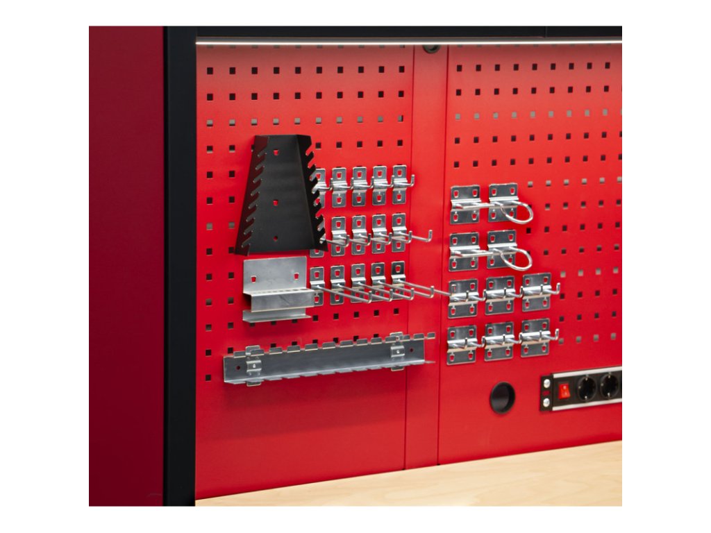 Součástí sady je 28 kusů nejčastěji používaných háčků a držáků pro zavěšení nástrojů, příslušenství, kabelů a drobných dílů.