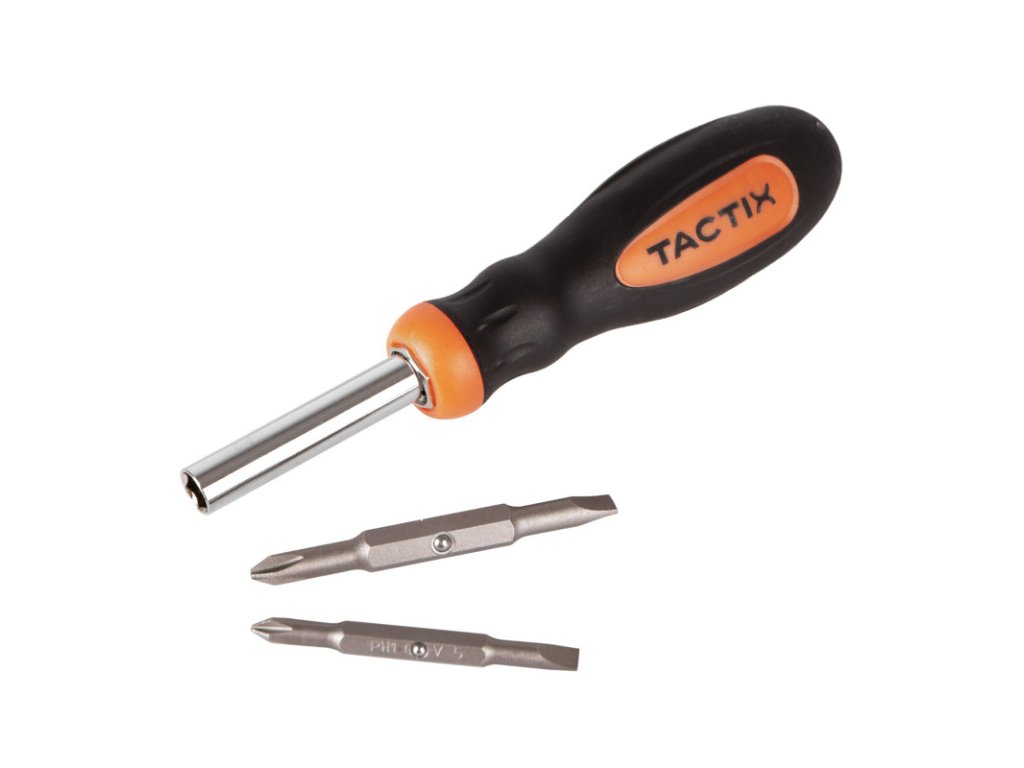 Šroubovák s vyměnitelnými hroty a ergonomickou rukojetí. Každý z hrotů je oboustranný a ve šroubováku drží pomocí kuličky. V balení naleznete hroty křížové PH1, PH2 a ploché 5 a 6 mm.