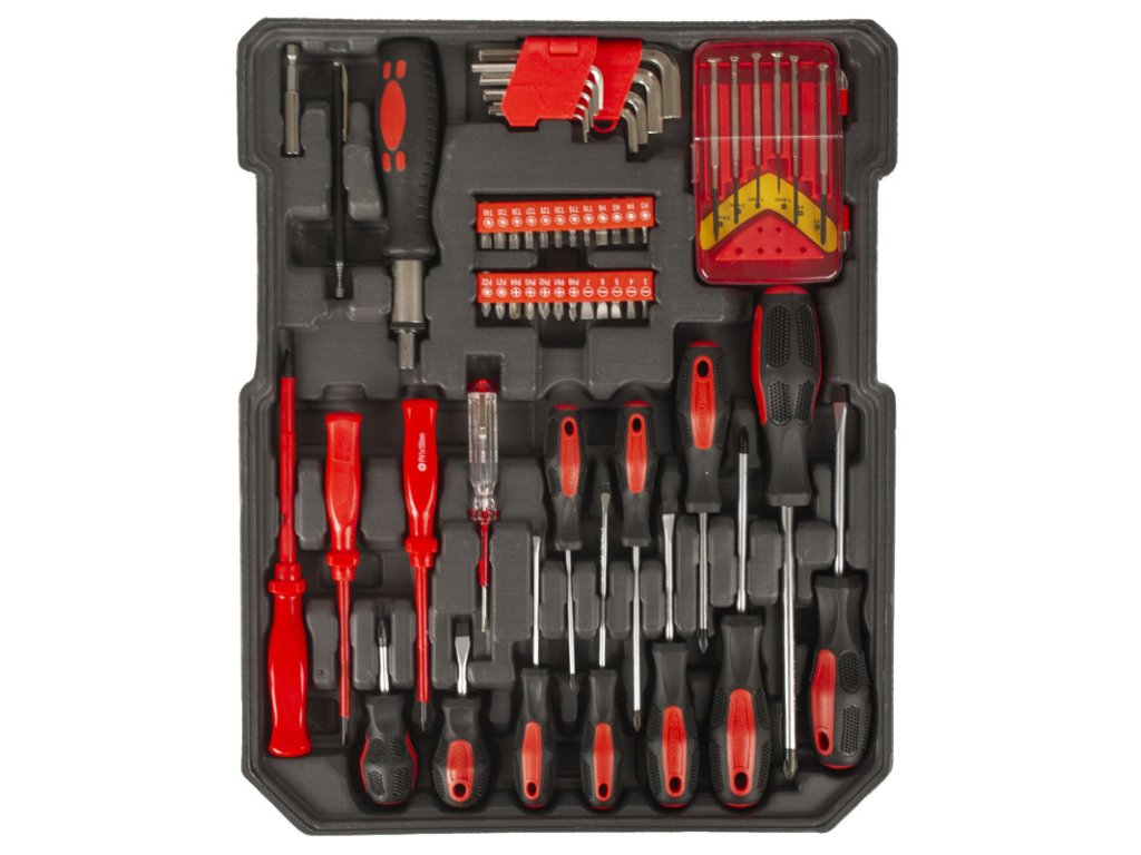 - Sada obsahuje celou řadu kleští, šroubováků, gola klíčů, kladivo, vodováhu, stranové i imbus klíče, bity, základní spojovací materiál a další nářadí, které je vhodné pro použití jak doma, v garáži, tak i na cestách.