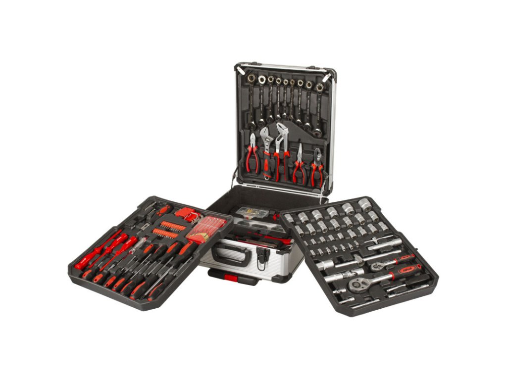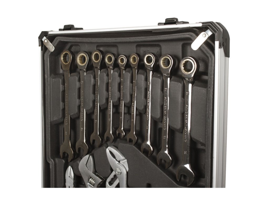 Kompaktní sada ručního nářadí se skládá ze 187 dílů včetně samotného hliníkového kufru. Nářadí je vyrobeno ze slitiny Cr-V a je prakticky uložené ve 4 plastových platech, které můžete vyjmout a v případě potřeby přenést na místo montáže pouze potřebné nářadí. Toto uložení zrychluje orientaci v nářadí, šetří Váš čas, usnadňuje práci a zaručuje perfektní přehled o chybějícím nářadí.