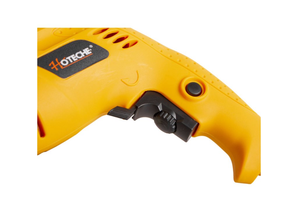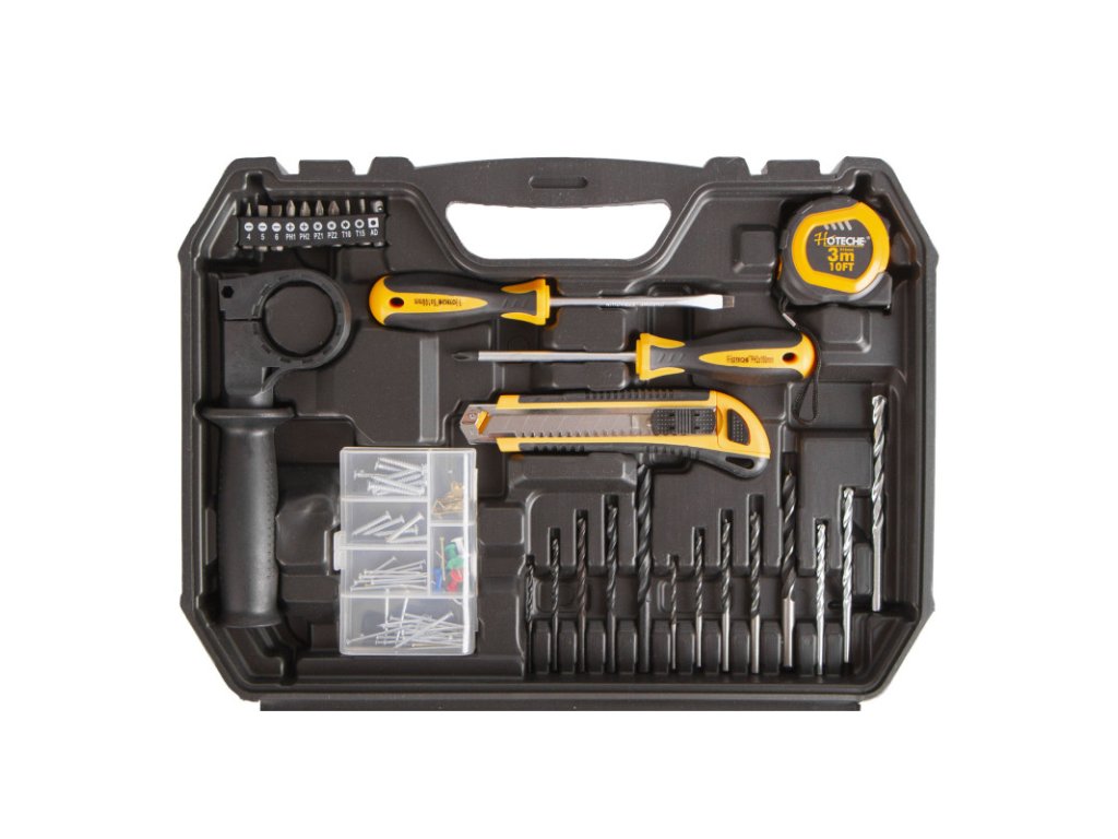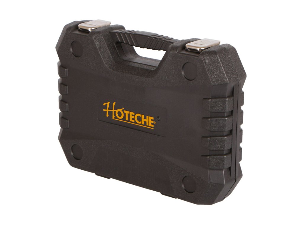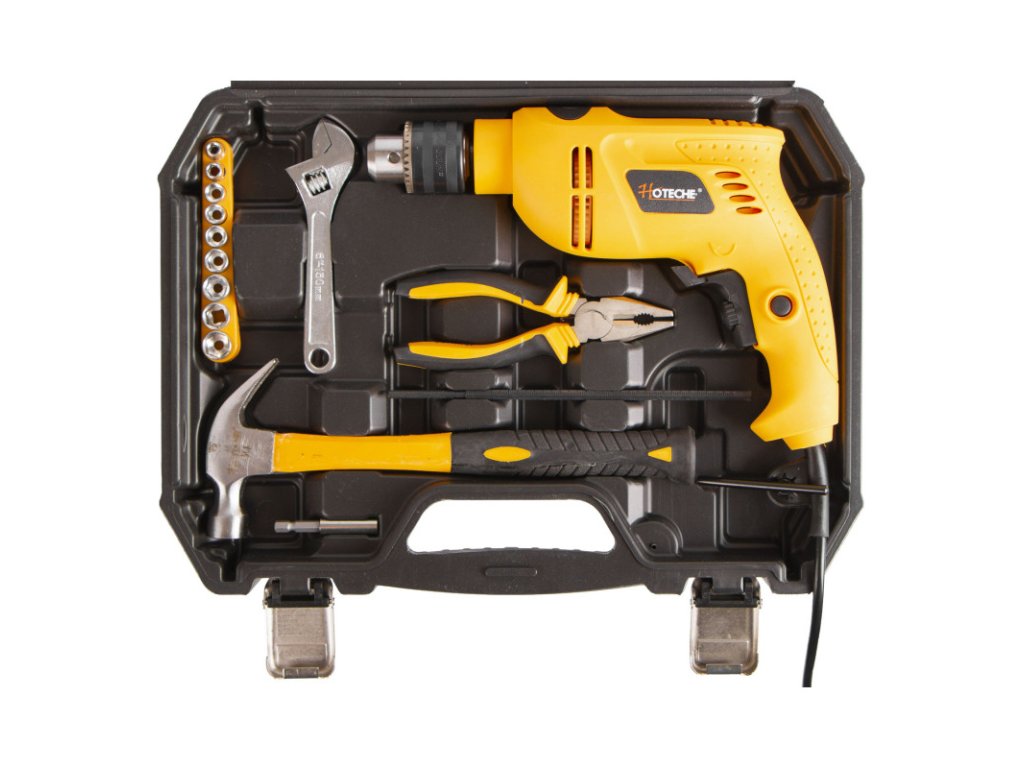 Sada nářadí s elektrickou příklepovou vrtačkou od značky Hoteche v plastovém kufříku.