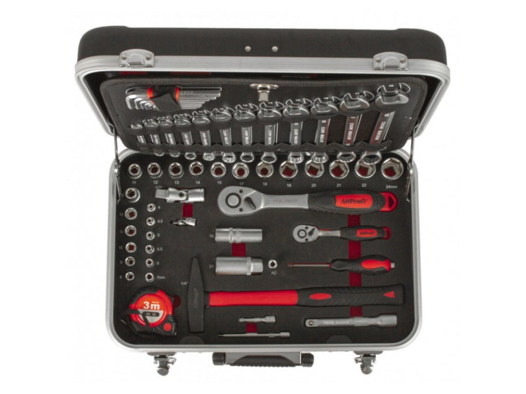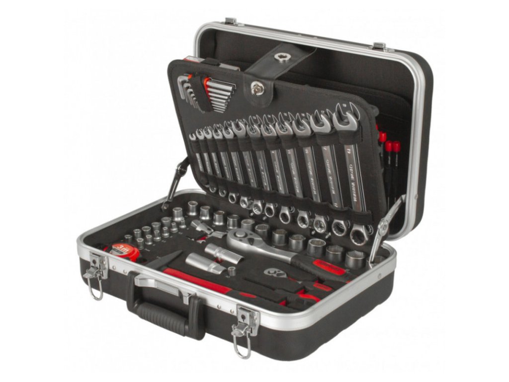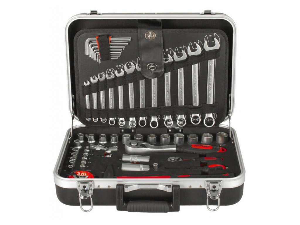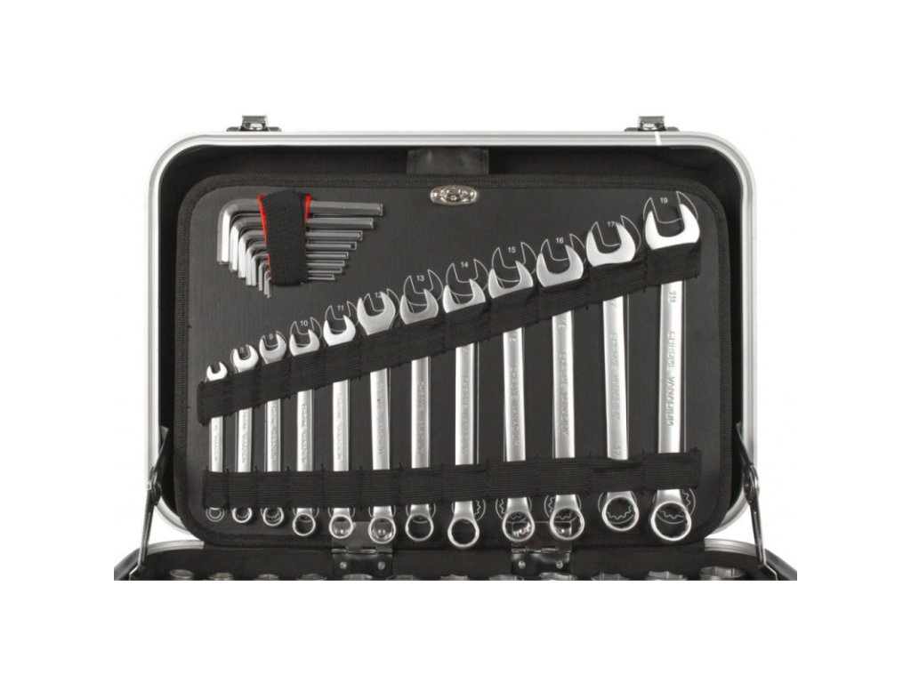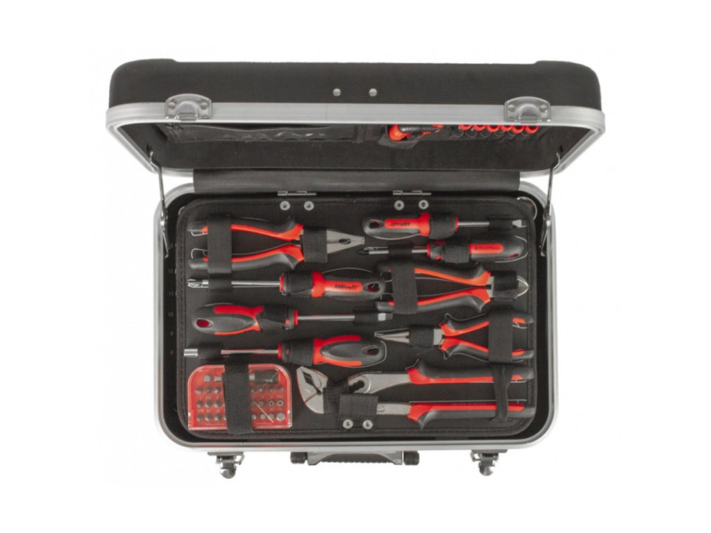 Uvnitř kufru se nachází několik sad profesionálního nářadí. Nářadí je vyrobeno ze slitiny Cr-V a jeho ergonomické rukojeti jsou příjemně pogumované, takže nekloužou, padnou do každé ruky a zajistí pohodlný úchop.
