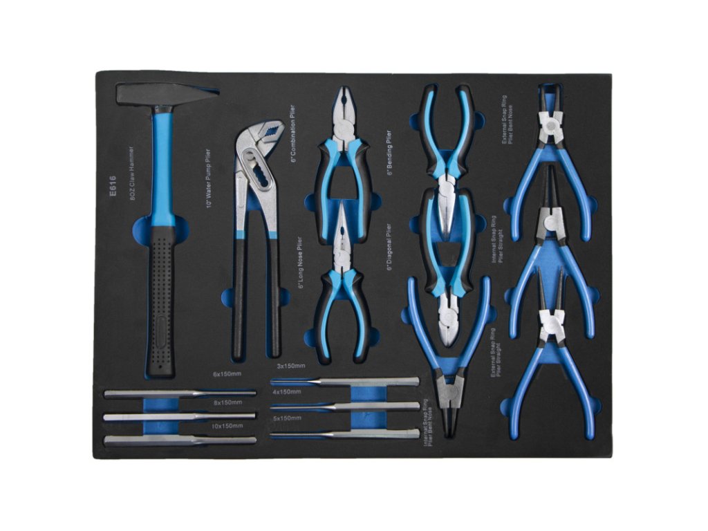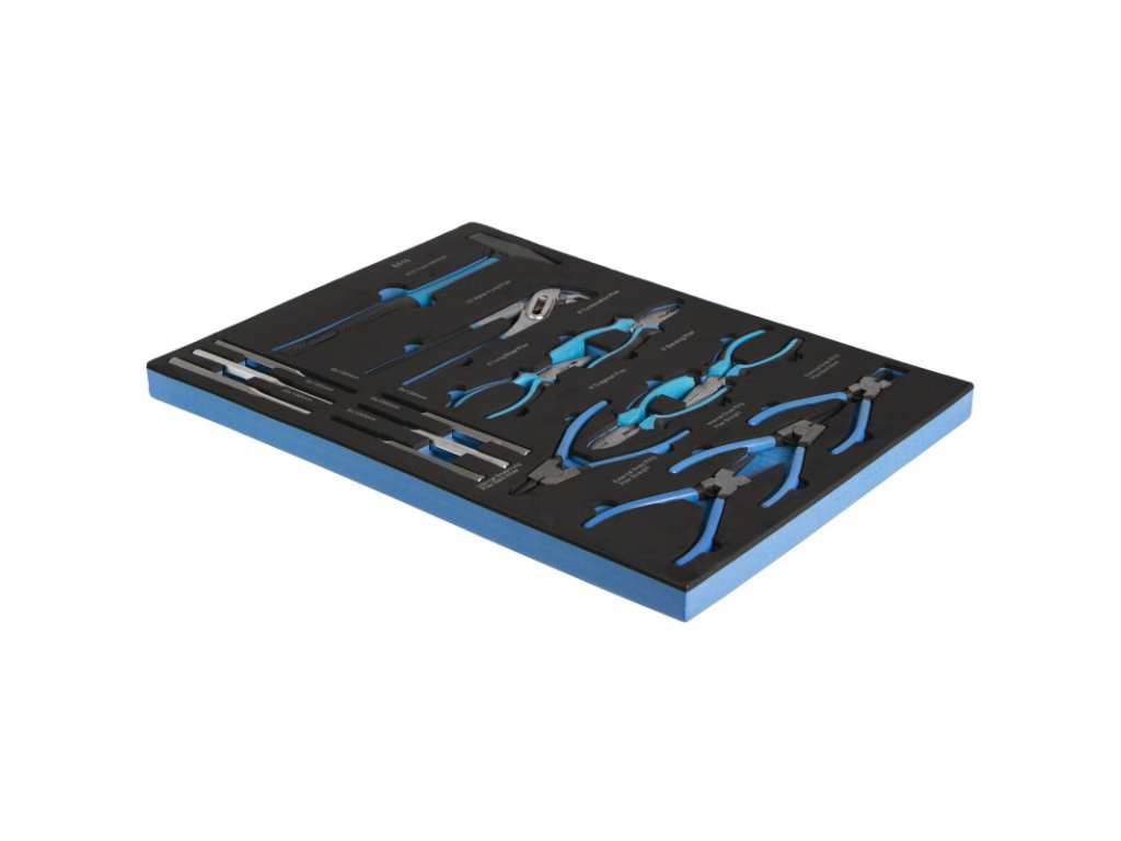 Univerzální sada kleští, vyrážečů a kladiva přehledně uložená v přesně tvarované pěnové výplni, kompatibilní s běžnými dílenskými vozíky.