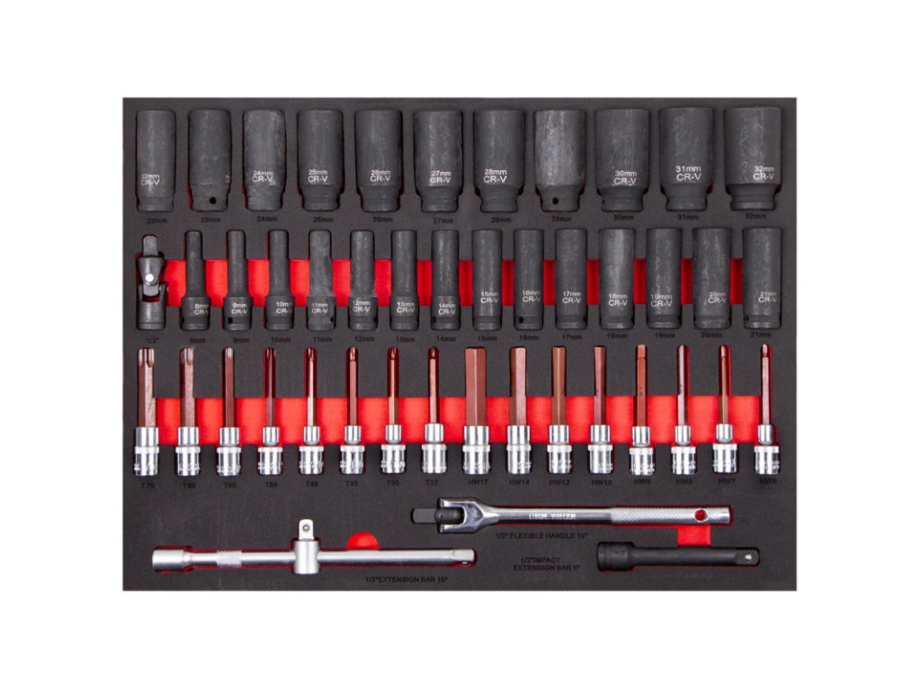 Sada hlubokých rázových hlavic, bitů a příslušenství 1/2" v praktické pěnové výplni, ideální pro náročné montážní a servisní aplikace.