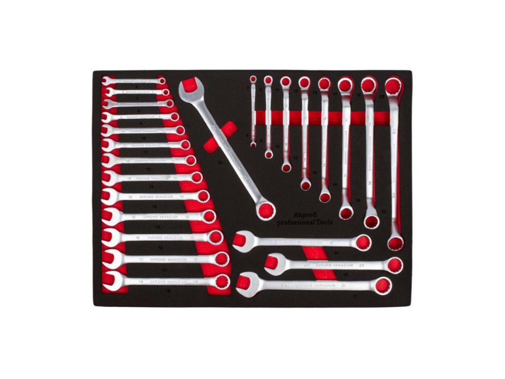Pěnová vložka o rozměrech 53 x 39 cm. Výplň obsahuje sadu očkoplochých klíčů (6 - 22 mm) a očkové vyhnuté klíče (6 - 22 mm).