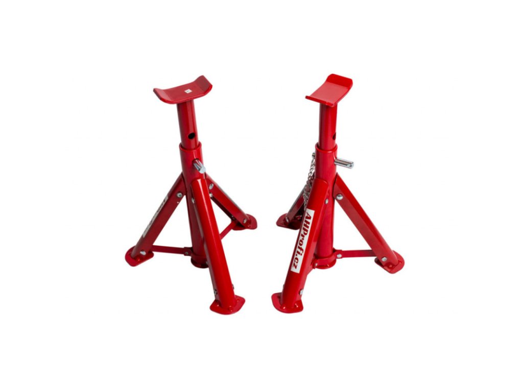 2 stavitelné podpěry s bezpečnostním kolíkem a nosností 2t - zdvih 277 - 365 mm.